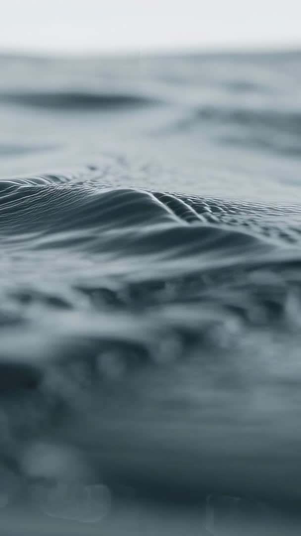 AI Generated Video. Showing extreme close-up of calm sea surface with delicate ripples and scattered droplets. Camera moving slowly from macro foreground toward soft horizon, creating shallow depth of field, gentle bokeh, and subtle motion. Featuring muted blue-gray tones under overcast light and rich water texture for tactile, meditative mood. Working well as vertical hero loop for mobile apps, social media reels, website headers, and full-screen backgrounds; useful as cinematic B-roll for documentaries, environmental stories, and travel pieces. Serving as abstract background for text overlays, title sequences, and product ads for marine, wellness, and surf brands. Providing loopable footage and flexible color grading room for matching diverse project tones and sound design.