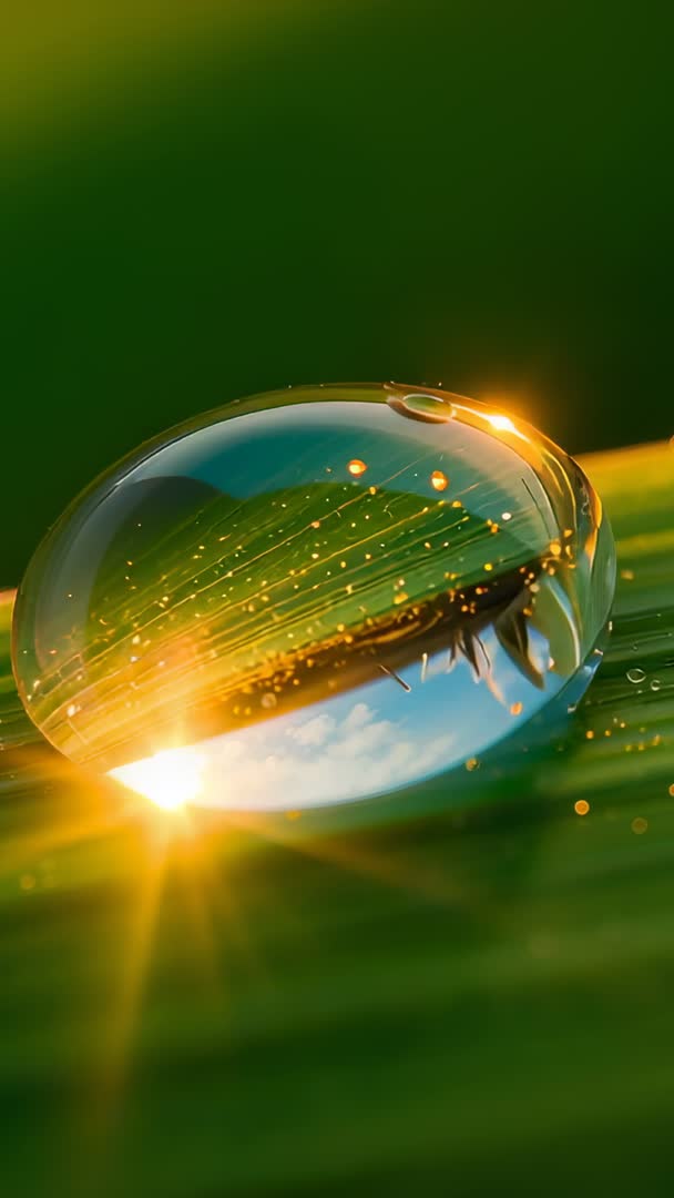 AI Generated Video. Showing single dewdrop catching warm golden sunrise light while reflecting leaf veins and tiny air bubbles. Capturing extreme macro detail with starburst flare, shallow depth of field, and soft bokeh, creating luminous green and gold palette. Working well for vertical video content, social media reels, nature documentaries, wellness and skincare campaigns, eco branding, and product closeups. Delivering calm, meditative mood for mindfulness apps, environmental storytelling, botanical tutorials, and macro photography lessons. Allowing text overlay at top or bottom, slow-motion or loop edits for seamless background, and color grading for cinematic looks.