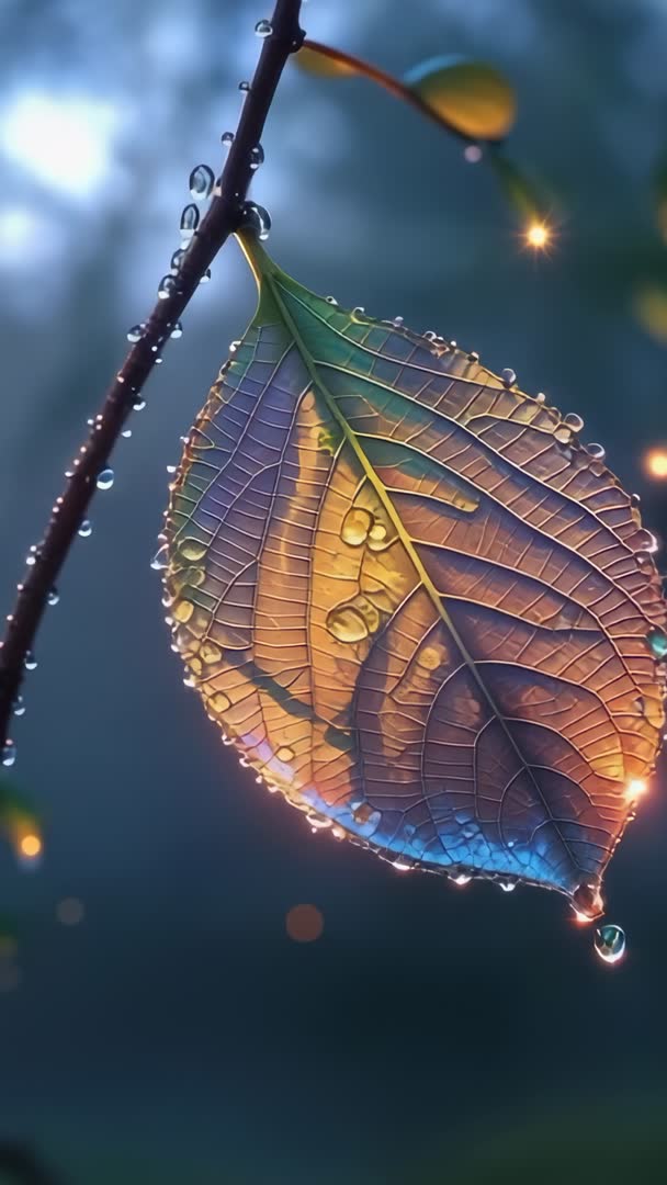 AI Generated Image. Single colorful leaf swaying on slender branch in misty dawn, crystalline dew droplets collecting along veins with one droplet detaching and falling. Warm golden highlights blending with cool blue undertones, revealing intricate vein texture and translucent edges while shallow depth of field creating soft bokeh. Vertical format offering cinematic close-up motion suiting mobile-first platforms. Footage suiting social media reels, mindfulness and wellness app backgrounds, slow-motion nature montages, and calming brand campaigns. Content working well as looping background for screensavers, website hero clips, product packaging visuals for organic or skincare lines, and editorial use in botanical or environmental stories.