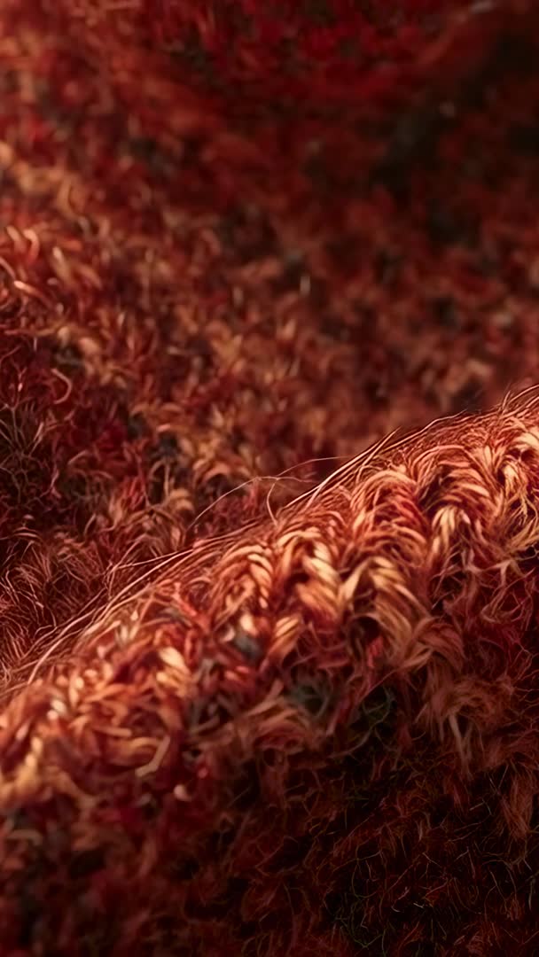 AI Generated Video. Vertical macro video panning across rust-orange knit fabric, revealing intertwined yarn fibers, stitch pattern, and fuzzy flecks. Warm autumn palette and tactile texture making content feel cozy and handcrafted. Useful for fashion and textile product pages, social media reels, vertical ads, knitting tutorials, and home decor lookbooks. Working well as looping background, hero header, or overlay for typography and branding. Providing close-up material study for designers, editors, and craft influencers. Suggested edits: creating seamless loop, applying warm color grade, adding soft ambient soundtrack, pairing with bold typography for seasonal campaigns.