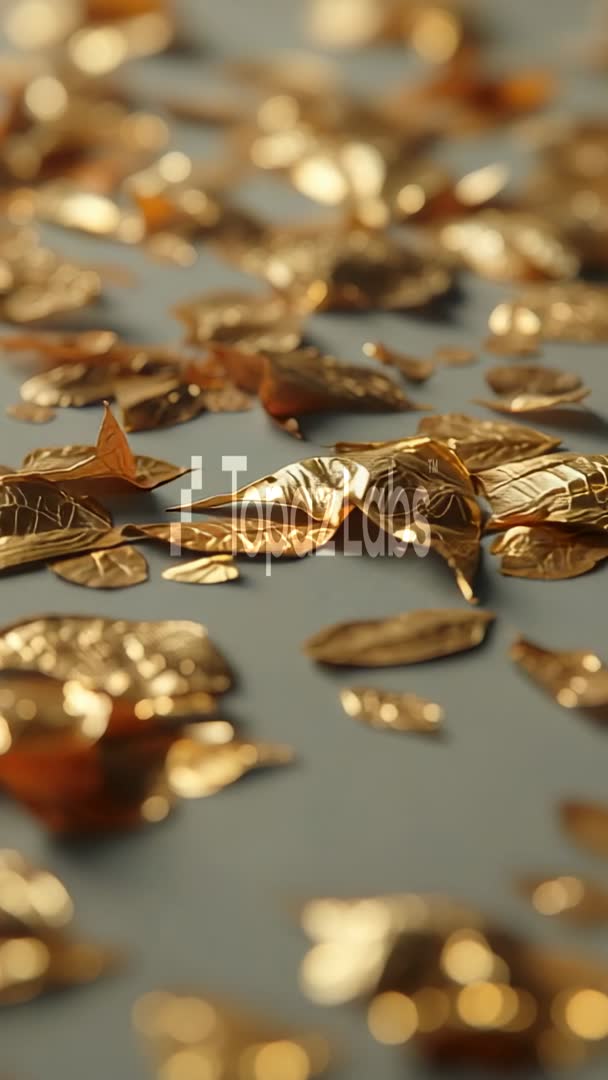 AI Generated Image. Vertical macro video racking focus across crumpled gold leaf fragments, revealing layered metallic texture and soft cinematic bokeh. Extreme closeup showing delicate veins and creased foil catching warm studio light, producing shimmering highlights and deep, creamy background blur. Shallow depth of field and slow focus pull creating immersive tactile feeling and elegant motion. Video working well as looping background for luxury product reveals, jewelry or beauty commercials, social media vertical ads, website hero sections, editorial transitions, and motion graphics overlays. Pairing with minimal typography, soft ambient music, and warm color grade enhancing premium aesthetic. Technical notes: ideal for 4K vertical delivery, provide versions at 24/30/60fps, consider seamless loop trimming and slight speed ramp for dramatic reveal.