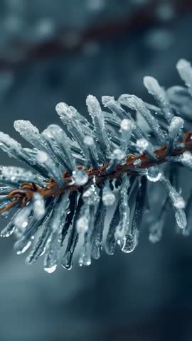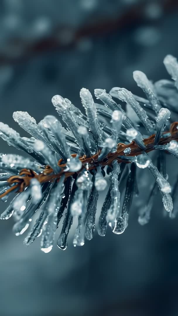 AI Generated Video. Shifting-focus vertical macro video revealing conifer twig glazed with translucent ice, needle tips forming elongated icicles and water droplets. Cool blue tones and shallow depth of field creating moody winter atmosphere. Slow camera movement and bokeh highlights adding cinematic feel. Usage suggestions: - Use as mobile background for winter-themed social media stories, Reels, and TikTok intros - Use as hero background for seasonal website banners, holiday product ads, and outdoor gear promotions - Loop as ambient clip for relaxation apps, screensavers, and storefront digital signage - Layer with ambient piano or wind sound for calming video content - Pair with text overlay for seasonal headlines, countdowns, and product launches Editing tips: - Crop for vertical mobile formats or reframe for widescreen using central detail - Adjust color grade toward cool cyan for dramatic mood or warmer tones for festive warmth - Reduce playback speed for cinematic slow-motion effect and add gentle crossfade loops for seamless repeats