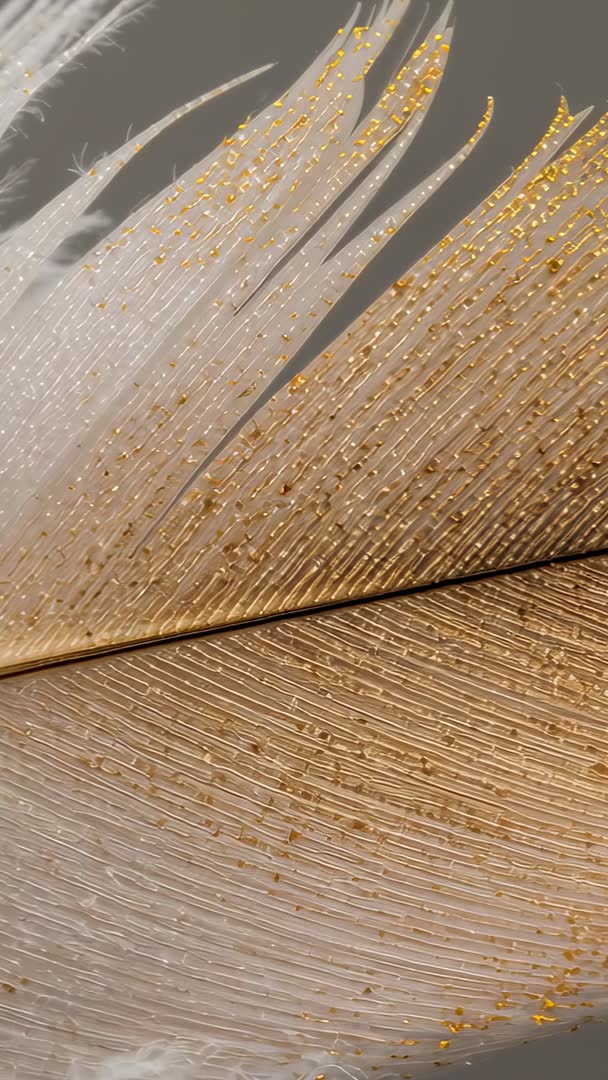 AI Generated Video. Video showing slow camera pan and shifting light revealing gold-flecked feather against soft gray backdrop. Camera panning across delicate barbs and vane, highlighting shimmering gold flecks, fine ridged texture, and soft bokeh. Footage offering closeup detail for luxury product promos, fashion intros, social media reels, website hero sections, and editorial motion. Serving as subtle glamorous background, overlay texture, or insert shot for product demonstrations, beauty tutorials, jewelry showcases, wedding motion invites, and packaging presentations. Clip working well for vertical formats such as Instagram Reels, TikTok, and mobile ads, with looping-friendly movement and warm neutral palette supporting color grading and branding.