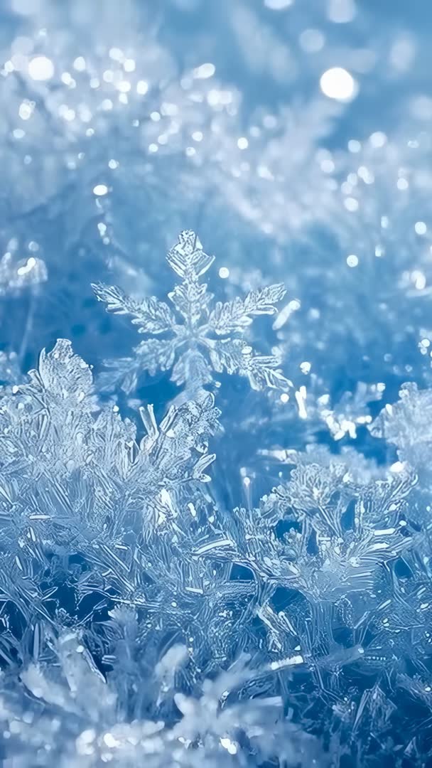 AI Generated Video. Vertical macro video showing hexagonal snowflake resting on frosty crystal bed while shifting lens revealing intricate facets and delicate arm patterns. Close-up shallow depth of field creating soft blue bokeh and sparkling highlights catching light across crystalline surfaces. Footage working well as slow-motion b-roll, looping background, or vertical hero clip for mobile-first content. Use cases including holiday marketing, winter product promotion, nature documentary openers, science explainers about snow crystal formation, social media reels, smartphone wallpapers, greeting card backgrounds. Editing tips including pairing with ambient piano or wind chime music, adding subtle slow zoom or parallax for extra motion, color-grading toward cool cyan tones, overlaying minimal text for seasonal messaging.
