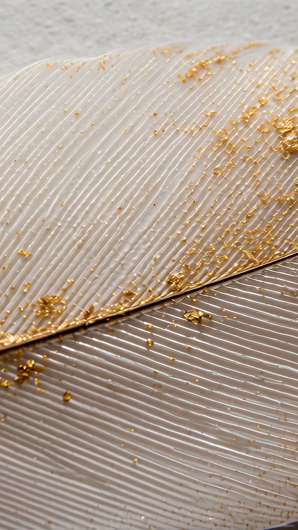 AI Generated Video. Showing slow focus shift across pair of pale cream feathers resting on light tray with delicate gold leaf flecks scattered along rachis. Capturing micro texture of barbs and shaft with shallow depth of field and soft neutral background, creating subtle metallic highlights and shimmering accents. Offering vertical macro composition suited for 9:16 social media formats and mobile-first storytelling. Working well as luxury beauty or jewelry background, product reveal clip, brand story element, wedding stationery animation, craft or gold leaf tutorial, and spa or lifestyle ambient loop. Providing elegant texture layer for motion graphics, title screens, or overlay for promotional text. Suggesting slight warm color grade, optional slow motion smoothing, and seamless looping for repeated playback.