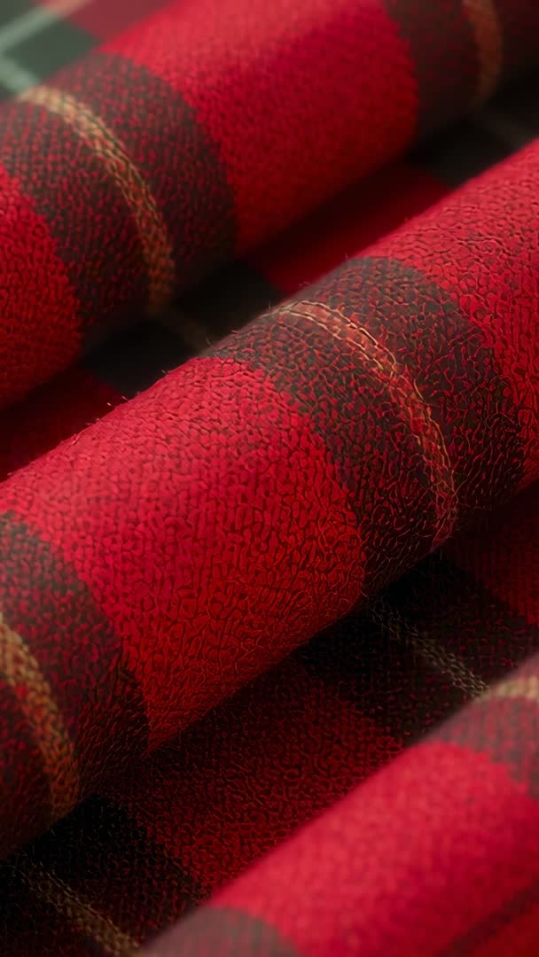 AI Generated Video. Vertical macro video sliding across red tartan fabric rolls, revealing dense woven texture and metallic gold thread trim. Close-up camera movement highlighting buffalo check pattern, deep red and black contrast, and fine stitching details. Warm, tactile mood suggesting cozy, rustic and holiday style. Useful for textile brand commercials, fashion or upholstery product pages, craft and sewing tutorials, social media vertical ads, and seasonal marketing campaigns. Working well as loopable background for website hero banners, Instagram Reels, TikTok clips, and vertical video ads. Allowing overlay text, logos, or product shots while maintaining strong visual texture. Capture notes: macro focus, shallow depth of field, slow slider motion, rich color saturation and high contrast for cinematic look.