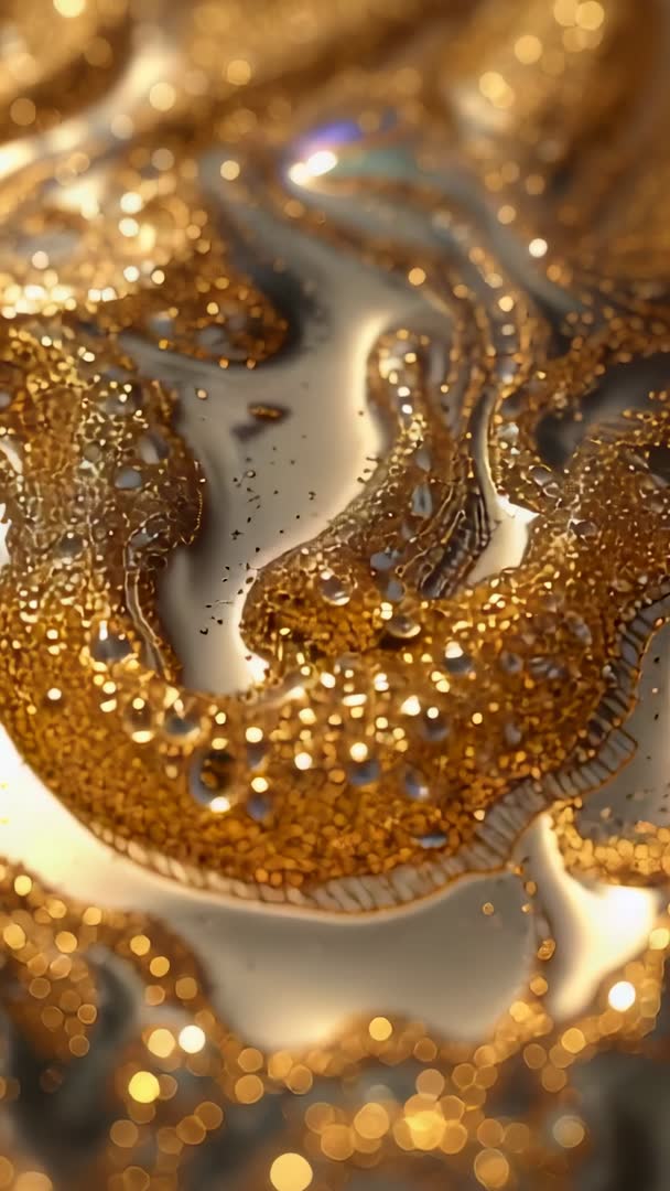AI Generated Video. Vertical macro footage showing shifting gold ridges, liquid metal flow, and tiny droplets catching light. Camera moving upward, revealing layered texture and shallow depth of field, creating soft bokeh highlights and parallax motion. Close framing and selective focus emphasizing microtexture and beads, warm golden tones evoking luxury and richness. Capturing in vertical 9:16 using macro lens, shallow depth of field, and slow dolly movement for cinematic feel. Ideal for luxury product backgrounds, motion graphics, vertical social ads, cinematic title sequences, beauty and jewelry promos, website hero loops, event visuals, smartphone wallpapers, and stock motion libraries. Recommend warm color grading, subtle glow and high contrast to enhance metallic highlights and sparkle.