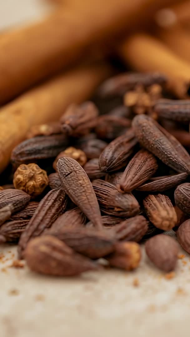 AI Generated Image. Vertical macro footage showcasing textured black cardamom pods and cinnamon sticks on neutral surface. Shifting focus to create shallow depth of field and soft bokeh while emphasizing pod ridges and cinnamon bark grain. Offering warm earthy palette and rustic mood for autumn, holiday, or comfort food themes. Ideal for recipe videos, spice packaging, food blogs, restaurant menus, cooking tutorials, social media reels, and product ads. Use as loopable background, opener clip, cutaway shot, product detail insert, packaging hero, or ingredient highlight. Pairing with ambient kitchen sounds or soft acoustic music; slowing playback to 24-30 fps for cinematic feel.