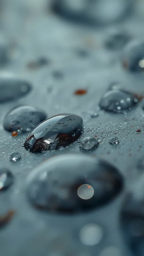 AI Generated Image. Shifting focus across glossy hydrophobic droplets on textured paint surface, capturing micro reflections and soft bokeh glints. Emphasizing surface tension, bead formation, and tiny brown pigment specks for abstract composition. Vertical orientation and cinematic shallow depth of field creating immersive macro motion suited for backgrounds, product intros, or science explainer segments. Useful for commercial advertising of coatings, automotive finishes, or waterproof textiles, editorial content on materials science, or visual loops for social media reels and phone wallpapers. Offering high-detail close-ups for slow-motion sequences, transitions, and motion graphics overlays.