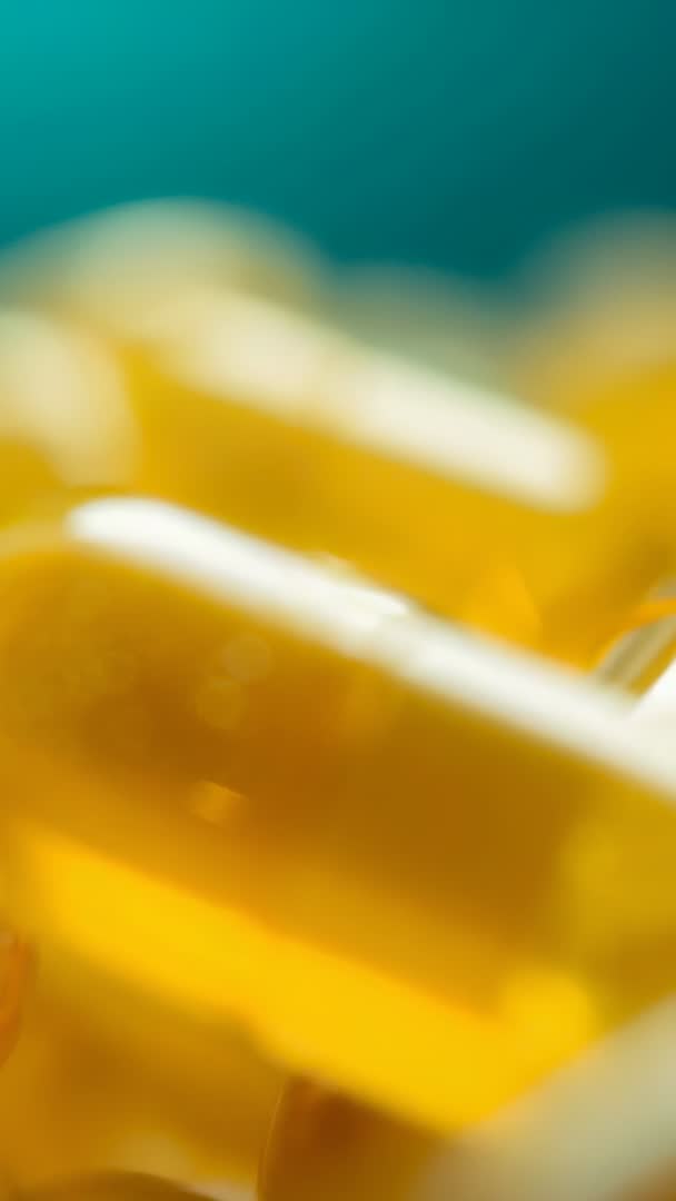 AI Generated Image. Vertical macro clip shifting focus to reveal translucent amber softgels glowing with soft reflections and tiny air bubbles on teal backdrop. Suiting supplement branding, vitamin and fish oil promotions, pharmaceutical web banners, social media reels, in-store digital displays, wellness blog headers, packaging motion, educational presentations. Featuring shallow depth of field and soft bokeh for abstract close-up visuals. Suggesting looping short segments, cropping for vertical formats, applying gentle color grade to enhance teal-amber contrast, adding subtle ambient music or soft whoosh transitions. Containing product-like content; ensuring compliance with local advertising and medical claim regulations before commercial use.