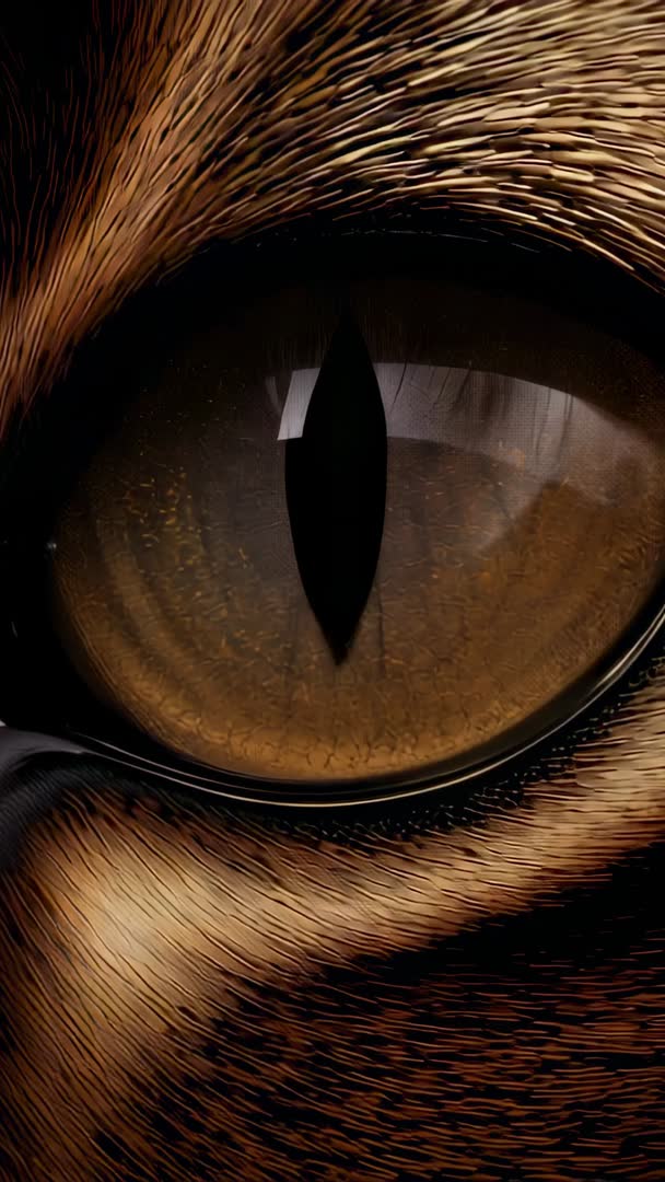 AI Generated Video. Vertical macro video capturing extreme closeup of amber feline eye with vertical slit pupil reacting to shifting light and reflecting rectangular highlight. Fine iris texture and surrounding striped fur showing crisp detail and deep contrast. Vertical framing making footage ideal for mobile content, social media reels, stories and app backgrounds. Working well for wildlife sequences, pet care campaigns, mystery or thriller promos, eye care or optical design visuals, texture or abstract backgrounds, and VFX reference. Editing ideas include using slow motion reveal, zooming out to full cat body, color grading to warm or cool tones, and overlaying text or animated graphics on dark areas. Suitable for commercial licensing, editorial use, title openers, educational programs, veterinary presentations, and creative advertising.