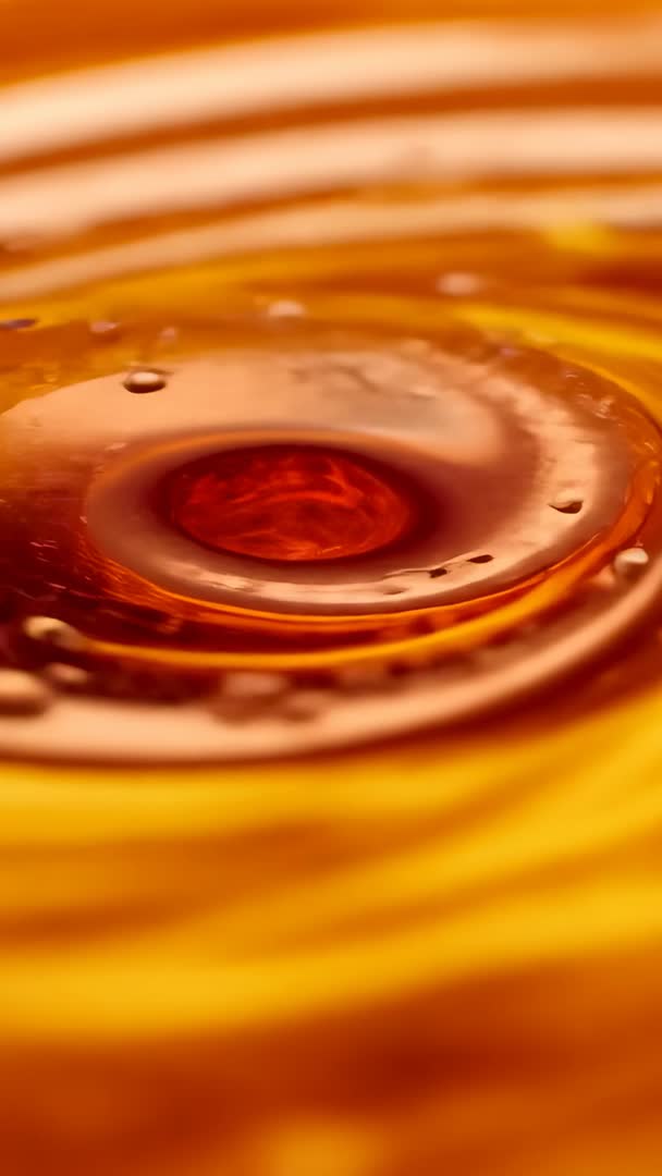 AI Generated Video. Closeup vertical macro footage showing amber viscous surface reacting to droplet impacting and forming deep vortex with concentric ripples and tiny bubbles. Red bead at vortex center adding contrast and focal interest. Warm amber and orange tones creating rich, moody abstract look. Studio lighting capturing crisp fluid motion with slow motion emphasis on texture and wave patterns. Useful for food and beverage advertising, honey or syrup branding, product packaging video, and culinary social media vertical ads. Also useful for science and education about fluid dynamics, motion graphics overlays, website hero backgrounds, and mobile wallpaper loops. Loopable format enabling seamless background use in presentations, digital signage, and multimedia projects. License suitable for commercial and editorial use.