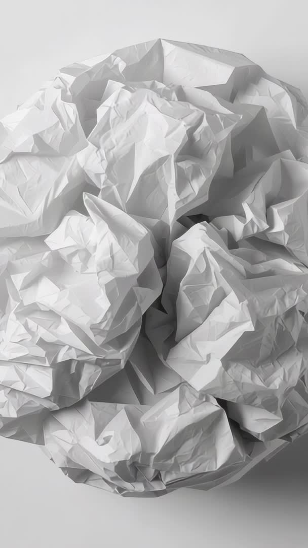 AI Generated Video. Moving camera showing lower folds of crumpled white paper on light tray, revealing intricate creases, sharp facets, and subtle shadow play. Closeup macro framing capturing high-detail texture and soft studio lighting for clear tonal range and tactile feel. Vertical format optimizing use on mobile and social platforms, including reels and short-form content. Suitable for web backgrounds, texture overlays, packaging mockups, editorial motion, title sequences, and abstract art projects. Working well for minimal product backdrop, sustainability or recycling concept visuals, and print materials requiring tactile texture. Providing loopable motion option and color grading flexibility for designers, videographers, and content creators.