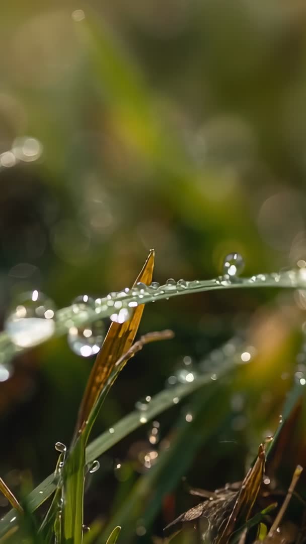 AI Generated Video. Video is showing shifting camera pulling dewy grass blade into sharp focus while droplets cling to blade edge and refract soft morning light into round bokeh highlights. Shot with tight macro framing and shallow depth of field to create intimate, meditative mood. Movement is slow and cinematic, emphasizing delicate textures, reflective droplets, and fresh green tones. Use for background footage in nature, wellness, relaxation, meditation, and environmental campaigns. Work as opener for gardening tutorials, weather or morning routine segments, eco-brand promos, and social media reels or vertical ads. Pair with ambient field recordings or gentle piano for calming effect, or combine with text overlays and voiceover for product storytelling. Provide high-resolution vertical source for smartphone wallpapers, short-form video content, and hero clip in landscape-to-vertical edits.