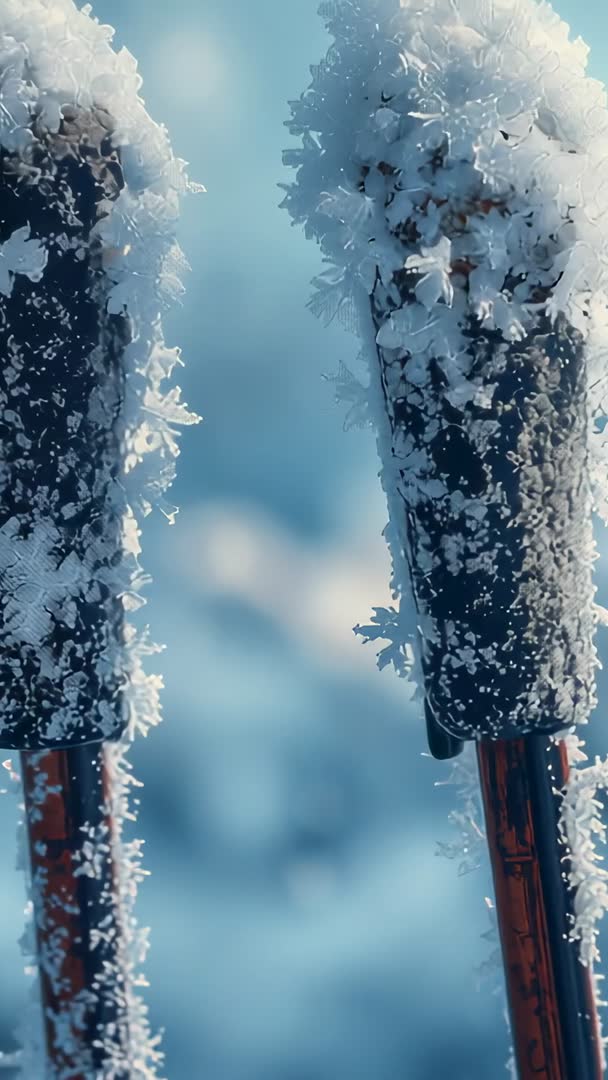 AI Generated Image. Showing macro vertical clip of frost crystals forming into delicate lace on two slender metal rods against blurred blue background. Featuring intricate ice lattice, fine surface texture, and sparkling highlights ideal for slow-motion playback and close-up study of crystallization. Capturing cold atmospheric mood with shallow depth of field and high contrast blue tones. Serving as background for seasonal social media posts, supporting winter product commercials, enhancing nature documentary b-roll, and providing texture reference for designers and visual effects artists. Working well as loopable clip for title screens, ambient backgrounds, and educational segments about freezing processes. Providing vertical orientation optimized for mobile storytelling and reels.