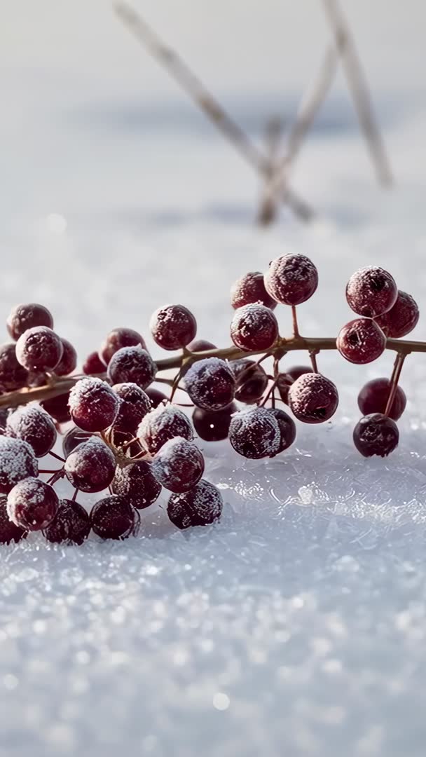 AI Generated Video. Showing vertical macro study of frosted red berries resting on snow, camera shifting slowly to reveal delicate ice crystals on berry surfaces. Capturing crisp winter textures, rich red tones, and shallow depth of field for elegant seasonal visuals. Working well for social media stories, vertical ads, mobile wallpapers, holiday greetings, and seasonal product promotions. Looping friendly short clip for using as website hero background, title opener, or ambient backdrop for cooking and cocktail videos featuring winter ingredients. Pairing easily with soft wind or crunching snow sound effects, subtle color grading toward cool tones, and light vignette for added focus on frost detail. Delivering versatile asset for greeting cards, nature documentaries, botanical education, and texture overlays for graphic design.
