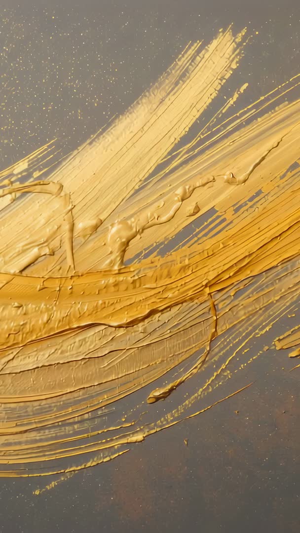 AI Generated Video. Video showing rich gold paint stroke smoothing across dark speckled panel, highlighting thick creamy texture, paint ridges, and shimmering metallic flecks. Macro close-up capturing brush movement, glossy highlights, pigment settling and flowing for tactile abstract effect. Footage working well as loopable background for luxury brand promo, beauty or cosmetics commercial, packaging reveal, social media story, and title opener. Clip providing detailed texture for motion graphics, product overlay, editorial layout, gallery projection, and advertising spots. Color grading friendly and easy to mask for transitions, overlays, slow-motion detail shots.