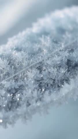 AI Generated Video. Vertical macro clip showing hoarfrost sparkling along leaf midrib at dawn, revealing intricate ice crystals and soft blue bokeh. Closeup slow-motion potential creating calming, meditative visuals for mobile reels, social media stories, or background loops. Use for winter product ads, seasonal greeting cards, nature documentaries, botanical features, or environmental campaigns seeking delicate texture and chilly atmosphere. Leave negative space at top and bottom for text overlays or logos; apply gentle color grading to emphasize cool tones and add cinematic mood. Looping clip working well as ambient backdrop for wellness apps, mindfulness videos, or luxury packaging promos for cold-weather collections. Supply RAW or color-graded versions for editors; include 4K options and crop-safe margins for vertical formats.