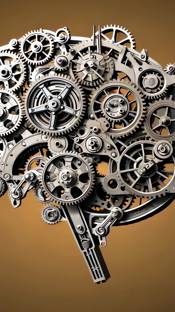 AI Generated Image. Close-up vertical video showing complex mechanical brain built from interlocking metal gears and rods. Camera zooming and panning, focusing on meshing gear teeth, pistons and linkage details. Studio lighting and shallow depth of field highlighting metallic texture and motion. Perfect for technology presentations, engineering explainers, neuroscience metaphors, automation promos and robotics campaigns. Use as corporate opener, website hero banner, mobile background, social media short, product demo or visual loop for exhibition displays. Looping segment and slow motion cuts working well for dramatic emphasis. Color grading toward cool steel tones or warm bronze contrast adding mood. Available in vertical format optimized for mobile and portrait-first platforms. Usage ideas include background for AI concept videos, transition clip for product launches, visual metaphor for teamwork and system thinking, intro for engineering tutorials and educational content.