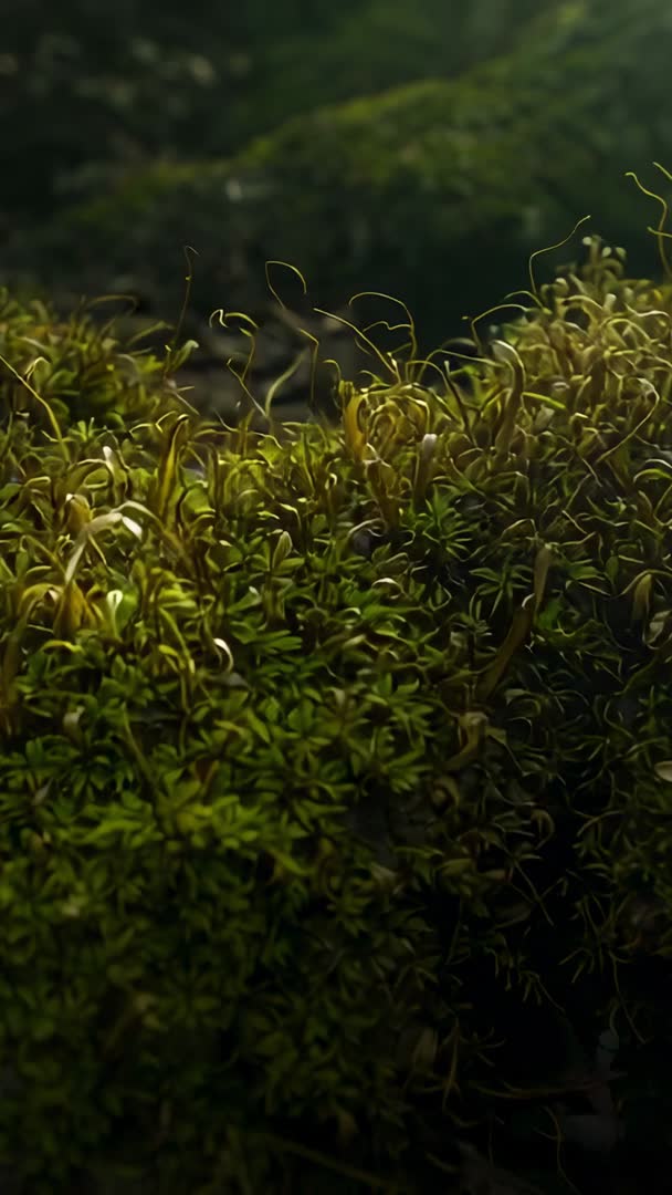 AI Generated Video. Showing dense green moss mat with slender sporophyte stalks rising above cushiony foliage, captured in vertical macro format. Featuring slow upward camera pull, soft natural light, and shallow depth of field to emphasize texture, tiny spore capsules, and subtle movement. Serving well for nature documentaries, botanical education, ecological presentations, environmental campaigns, vertical social media reels, and mindfulness or meditation backgrounds. Working as B-roll for science explainer videos on bryophyte life cycles, closeup study of plant morphology, or branding projects seeking organic textures. Providing loopable background, title sequence texture, and color grading flexibility for matching project mood.