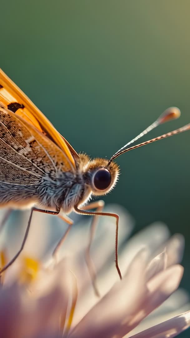 AI Generated Video. Vertical macro clip focusing on head, compound eye, antennae, and wing texture of orange-brown butterfly probing pale pink daisy for nectar. Shallow depth of field and soft bokeh creating calm, intimate mood. Warm backlight accentuating fine hairs and translucent wing edges, highlighting delicate movement of proboscis and legs. Vertical framing optimized for full-screen mobile playback and social platforms. Ideal for nature documentaries, environmental awareness campaigns, pollination education, entomology presentations, and smartphone vertical ads. Useful for social media reels, Instagram stories, TikTok clips, mobile wallpapers, hero backgrounds for websites, and editorial spreads in science or travel magazines. Recommended color grade: warm tones to enhance orange and green contrast; consider gentle slow-motion, close-cut edits, and ambient meadow audio to strengthen viewer engagement.