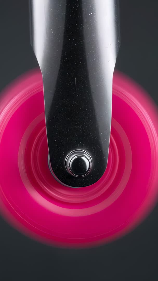 AI Generated Video. Opening with magenta caster wheel rotating in tight macro close-up beneath brushed steel fork and polished bolt. Showcasing crisp metal reflections and subtle motion blur to highlight smooth rotation and hardware detail. Offering vertical frame optimized for mobile reels, social stories, and short-form video ads. Serving as loopable background for product demos, furniture retail promos, industrial design showcases, DIY and maker tutorials. Pairing well with bold typography overlays, upbeat music, or minimalist voiceover for tech and lifestyle campaigns. Delivering vibrant color contrast and abstract motion useful for hero headers, app splash screens, packaging motion mockups, and transitional B-roll in longer edits.