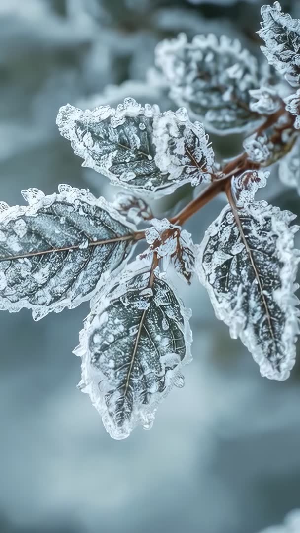 AI Generated Video. Video showing serrated leaves coated in clear ice and revealing intricate vein patterns beneath crystalline layer. Camera capturing tight macro detail and soft bokeh background to evoke serene winter mood. Footage working well for seasonal advertising, social media reels, Instagram and TikTok vertical content, website hero banners, and calming screensavers. Serving educational pieces on plant frost and cold-weather botany, environmental campaign visuals, product promos with winter themes, and nature documentary b-roll.