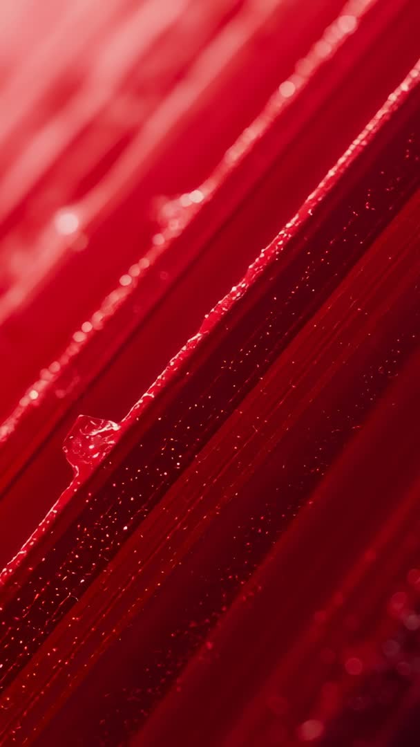 AI Generated Image. Showing dramatic close-up of water droplet elongating along vivid red petal under controlled lab lighting. Capturing tiny suspended droplets and glittering bokeh along petal edge. Providing strong diagonal composition and high color contrast for vertical screens and mobile reels. Working well for beauty and cosmetics commercials, product packaging, botanical editorial, scientific demonstration, nature documentaries, social media reels, and phone wallpapers. Supplying rich texture and abstract detail for backgrounds, overlays, and motion graphics. Pairing naturally with slow-motion playback and ambient soundtrack to emphasize delicate movement and moisture.