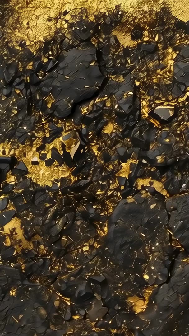 AI Generated Video. Vertical video showing camera sliding across cracked black plates, revealing veins of gold leaf and reflective metallic foil. Macro closeup emphasizing textured fragments, glossy highlights and deep shadows, producing high contrast abstract composition. Slow cinematic movement creating elegant reveal for gallery projection and mobile viewing. Working well for luxury branding, jewelry and cosmetics advertising, fashion lookbooks, premium packaging visuals, editorial motion backgrounds and social media vertical ads. Useful as loopable background or texture overlay for motion design, title transitions and product reveal animations. Pairing with minimal typography and muted color palettes enhancing premium feel. Supplied footage fitting vertical formats for mobile stories and portrait video campaigns.