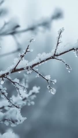 AI Generated Video. Vertical macro video showing thawing twig covered in melting snow and forming clear icy droplets. Close-up composition featuring crystal-like beads sliding from thin branch against soft blue bokeh, creating quiet rhythmic motion. Useful for adding calming nature B-roll to social media reels, smartphone wallpapers, and vertical ads. Working well for seasonal marketing, winter weather segments, environmental storytelling, meditation and relaxation sequences, and title openers for documentaries. Easy to pair with ambient music or soft voiceover. Offering slow motion-friendly footage for emphasizing droplet motion and delicate texture. Color palette featuring cool blues and muted browns, suiting minimalist layouts and copy overlay.