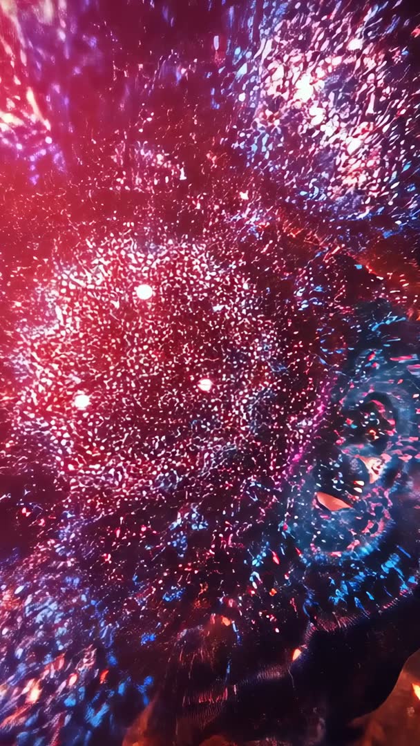 AI Generated Image. Vertical mandala projection video showing projector casting kaleidoscopic magenta and cyan patterns on ceiling, pulsing three bright white points for rhythmic mood. Radial concentric visuals creating hypnotic, meditative atmosphere with high-energy neon color palette. Ideal for music visual loops, DJ and VJ backgrounds, social media reels, meditation app intros, event openers, stage backdrops, mood lighting promos. Serving brand ads, ambient website headers, smartphone wallpapers, promotional videos, generative art projects. Loop-friendly composition and vertical format optimizing mobile-first platforms and short-form video content.