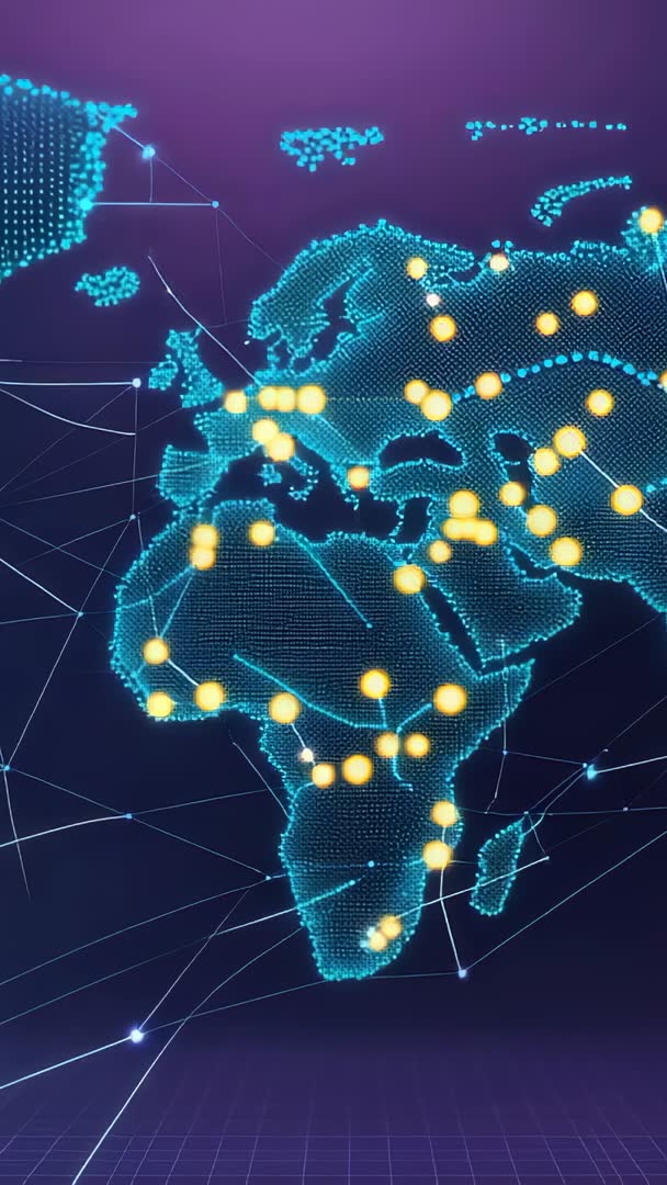 - Vertical Map Animation: Global Network Connectivity with Pulsing Nodes and Data Links