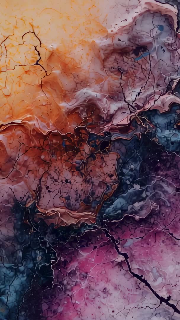 AI Generated Video. Showing vertical panning from upper-left down over marbled canvas with cracked fissures and rich color layers of orange, pink, purple and deep blue. Featuring close-up texture details, paint veins, and subtle metallic highlights. Working well for background in social media reels, smartphone wallpapers, title sequences, motion graphics, music visualizers, interior mockups, packaging design, and art documentaries. Serving as loopable clip for ambient screens, gallery projections, retail displays, and storefront video walls. Suggesting color boost for vivid output, subtle vignette for visual focus, and slow crossfade for seamless looping. Providing high-resolution vertical format optimized for mobile platforms and portrait-oriented campaigns. Licensing allowing use in commercial ads, editorial spreads, digital branding, and creative portfolios.
