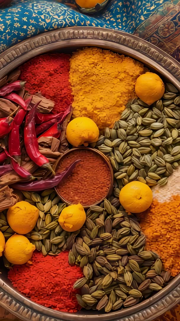 AI Generated Image. Gliding over colorful spice tray, camera highlighting rich textures of turmeric powder, red paprika, green cardamom pods, dried red chilies, cinnamon sticks, and preserved citrus. Close-up motion creating calming loop for social media reels and vertical ads. Perfect for recipe intros, market promotions, spice brand packaging, cooking class promos, food blog headers, cultural festival visuals. Color palette and texture detail providing inspiration for product packaging, branding mockups, restaurant menus, and marketing banners. Loop-friendly framing and steady camera movement supporting mobile-first platforms such as Instagram Stories, TikTok, and YouTube Shorts.