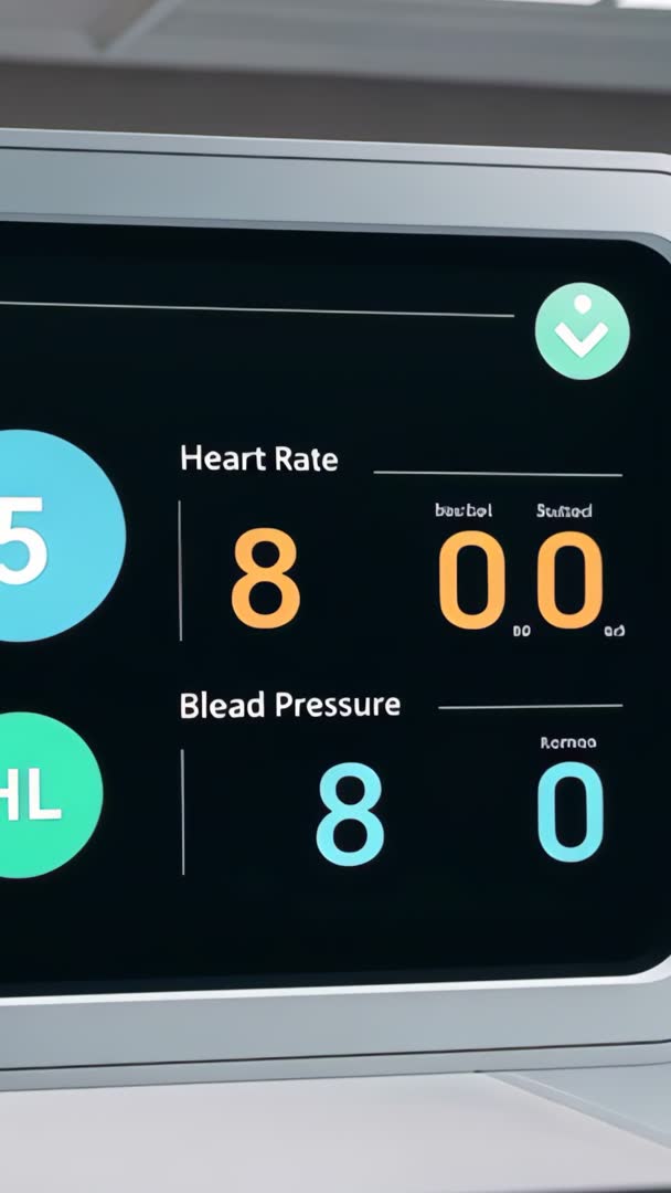 AI Generated Video. Vertical video featuring clinical monitor displaying vital signs dashboard with oversized numeric indicators and teal confirmation checkmark. Screen showing heart rate and blood pressure panels with circular badges and minimal dark UI, conveying stability and verified status. Footage suiting medical device marketing, telehealth platform demos, hospital website hero sections, training modules, UI design presentations, investor pitches. Usage suggestions: crop for mobile hero, overlay headline and logo on dark margins, add subtle motion graphics to emphasize readings, pair with ambient music or voiceover explaining monitoring workflow. Adjust color grading and typography for brand consistency. Royalty-free clip supporting editorial and commercial healthcare, diagnostics, technology projects.
