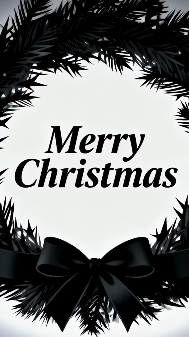 AI Generated Video. Video showing pulsing black wreath and swaying satin bow framing serif Merry Christmas headline on clean white background. Motion creating elegant monochrome holiday mood for luxury brands, boutique retailers, corporate greetings. Useful for Instagram Story, TikTok, Facebook Story, mobile ad, e-card header, email banner, website hero, digital signage. File allowing looping playback, headline text swap, and brand logo overlay. Color palette permitting quick recolor to classic red, green, or gold variants. Motion timing and rhythm fitting overlaying holiday music or short voiceover. Portrait 9:16 composition optimizing engagement for mobile-first campaigns and vertical reel placements.