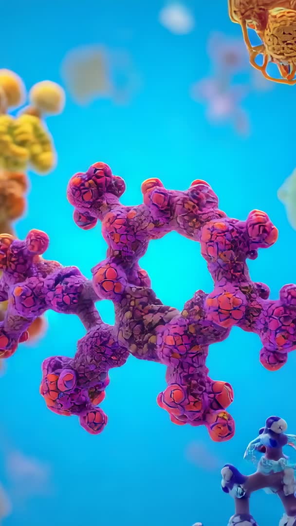 AI Generated Image. Showing vertical microscopic sequence panning and circling purple molecular cluster inside vibrant blue medium. Featuring pastel clusters in background adding depth and dynamic motion. Offering futuristic scientific aesthetic suitable for tech, biotech, education, and creative projects. Serving as looped background for social media reels, mobile app intros, website hero sections, presentation openers, and science explainer clips. Pairing with ambient electronic soundtrack or voiceover explaining molecular structures. Delivering high-impact colorful visuals for marketing, branding, and editorial use.