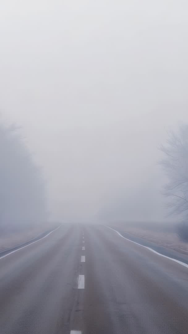 AI Generated Video. Vertical clip showing camera moving down rural two-lane road, dashed centerline leading toward vanishing point swallowed by dense fog. Bare tree silhouettes lining roadside, muted cool tones and soft diffused light creating moody, contemplative atmosphere. Use for social media reels, website hero banners, cinematic openers, weather or safety segments, and background for text overlays or lower-third graphics; ample empty upper frame providing clear space for titles and copy. Suitable for projects exploring solitude, travel, minimalism, mystery, or transition scenes; consider pairing with ambient music, slow piano, or subtle drone sound for added emotional impact. Looping works well for subtle motion backgrounds and meditative visual pieces.