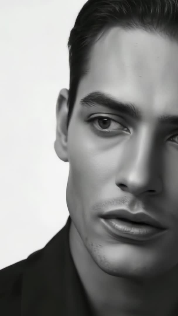 AI Generated Image. Featuring close-up monochrome portrait of man tilting head right and blinking, revealing sharp jawline and contemplative expression. Capturing subtle facial movement and smooth opening motion for vertical video platforms. Using soft directional lighting and minimalistic background to keep focus on facial contours and eye movement. Ideal for fashion promos, grooming campaigns, cinematic openers, actor showreels, mobile social media reels, dating app visuals, and editorial portrait sequences. Suggested edits: crop for 9:16 mobile ratio, add slow push-in or parallax for depth, keep monochrome grade or switch to muted color grade to match brand, place text overlay in upper left or lower third for title or credits.