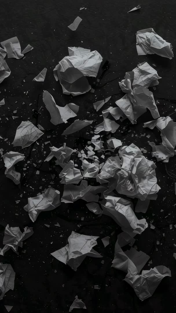 AI Generated Video. Vertical monochrome clip showing crumpled paper fragments scattered across dark tabletop. High-contrast composition emphasizing texture, shadows and negative space. Camera holding top-down framing with flat-lay arrangement, creating abstract minimalism and editorial mood. Ideal for use in social media vertical reels, title sequences, background loops, website hero sections and commercial spots needing raw tactile texture or concept of creative failure, brainstorming, rejection or recycling. Clip adapting well for overlays, motion graphics and cutaway shots; color grading and text overlay working cleanly on dark negative space. Recommended uses include editorial features, sustainability campaigns, art installations and product mockups needing gritty tactile backdrop.