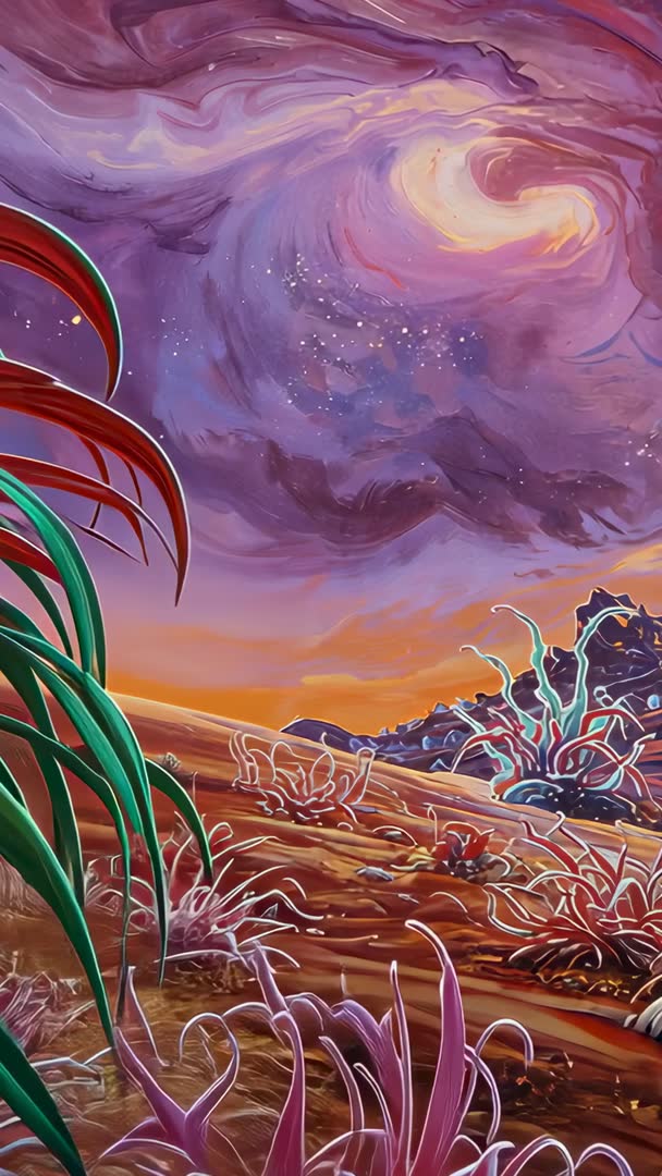AI Generated Video. Vertical video panning from wall, revealing immersive mural art showing surreal alien landscape with glowing anemone-like plants and swirling cosmic sky. Camera movement starting tight on wall fronds then pulling back, exposing vibrant painterly terrain and creating cinematic reveal, ideal for social media stories, gallery install previews, and creative brand spots. Suggesting use for interior design presentations, mural commission promos, museum exhibit trailers, background for music video intros, or vertical advertising on mobile platforms. Color palette featuring rich purples, magentas, teal greens and warm sunset tones, lending dramatic mood and fantasy atmosphere. Licensing working well for editorial features on contemporary art, environmental design, sci-fi concept showcases, decorative product mockups and stage or set visualizations.