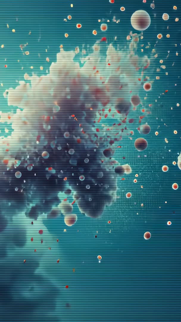 AI Generated Image. Vertical cinematic loop showing expanding dark nebula cloud emitting glossy spheres and red flecks over teal gradient with subtle horizontal scanlines. Motion moving slowly and fluidly, particles drifting outward while spheres rotating and catching light. Visual combining organic diffusion with digital scanline texture for futuristic, otherworldly look. Usage ideas: Background for tech presentations, sci-fi title sequences, music visualizers, mobile app intros, social vertical ads, VJ loops, broadcast bumpers, science and space explainers, meditation and ambient content. Customization tips: Color grading to brand palette, speed ramping for dramatic cuts, adding subtle glow or lens flare to spheres, overlaying animated text in upper third safe area. Technical notes: Loopable for seamless playback, optimized for vertical 9:16 platforms like Instagram Reels, TikTok, Snapchat, recommending export at 4K 60fps for crisp motion and scaling freedom.