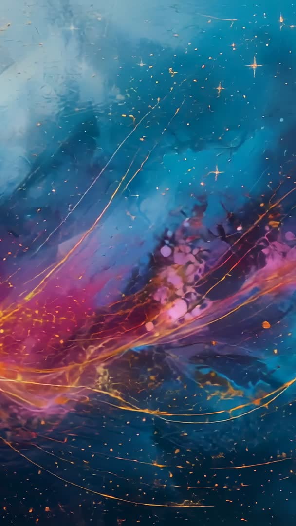AI Generated Video. Vertical video starting playback, cosmic nebula panning right, revealing glowing orange ribbon sweeping through iridescent blue and magenta clouds. Painted texture and layered gradients flowing like watercolor, with fine gold streaks and tiny star-like sparkles adding cinematic shimmer. Composition featuring dynamic diagonal motion and high-contrast color pops, creating immersive depth and energy. Ideal for motion backgrounds, title intros, social media reels, music visualizers, and sci-fi trailers. Useful as smartphone wallpaper, app background, product promo overlay, or event visual; loopable segment enabling seamless playback. Color grading and speed adjustments working well for creating atmospheric transitions, dramatic openers, and branded video content.