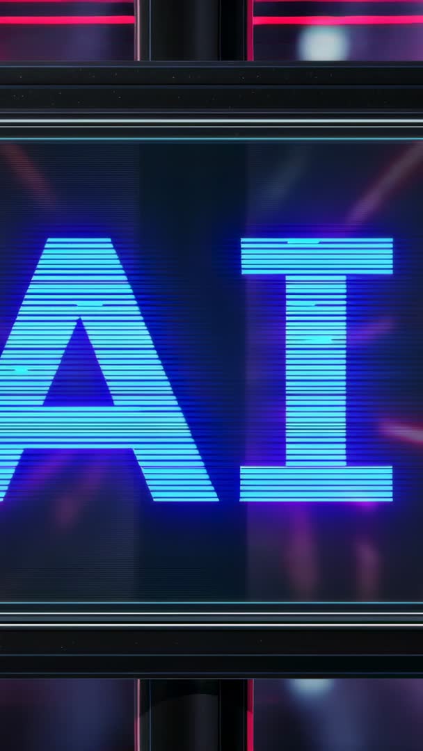 AI Generated Image. Showing close-up of vertical LED panel displaying large blue letters AI with horizontal scanline interference and digital glitch flicker then settling into steady neon glow. Clip starting with jittery scanlines and electronic noise then calming into stable high-contrast typography, providing strong cyberpunk and retro-futuristic mood. Vertical portrait format optimized for mobile platforms and social reels, suiting TikTok, Instagram Reels, and mobile ads. Useful for tech product launches, AI platform intros, conference openers, app demo backgrounds, website hero banners, broadcast graphics, VJ loops, and motion design promos. Recommend overlaying logo or tagline, adding glitch sound design and synth pulses, color grading to match brand palette, and using blend modes or particle overlays for enhanced depth. Loopable short clip providing eye-catching background for title cards, countdowns, transitions, and futuristic UI mockups.