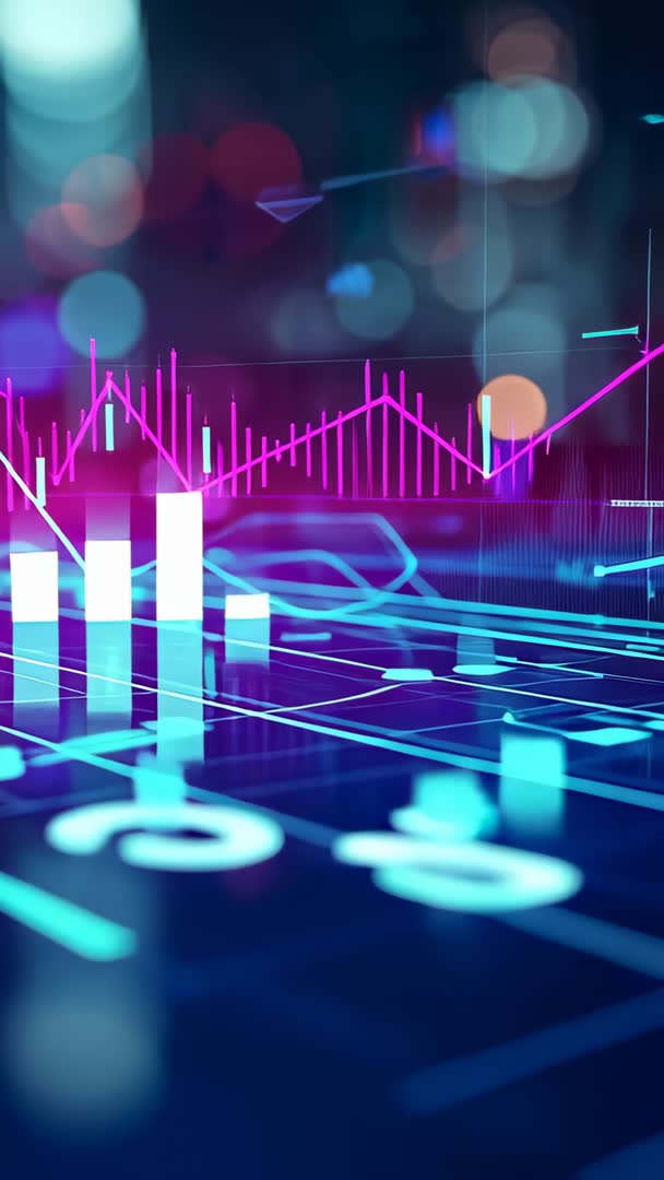 AI Generated Image. Vertical loop showing pulsing pink line graph over neon blue grid with rising cyan bars and soft bokeh highlights, creating futuristic analytics atmosphere. Color palette blending magenta and cyan on dark navy background, offering strong contrast for overlay text and logos. Motion design featuring smooth easing, subtle glow, and dynamic parallax creating visual depth. Perfect for powering tech startup promos, financial market recaps, trading dashboards, app demo reels, mobile social ads on TikTok and Instagram Reels, website hero sections, keynote backgrounds, broadcast overlays, and UI mockups. Clip looping and fitting vertical screens, enabling easy trimming and color grading. Recommended use cases including intro for data-driven videos, background for statistics or pricing pages, promotional ads for fintech products, and animated thumbnails for finance channels. Layering space allowing headline text and brand watermark placement.