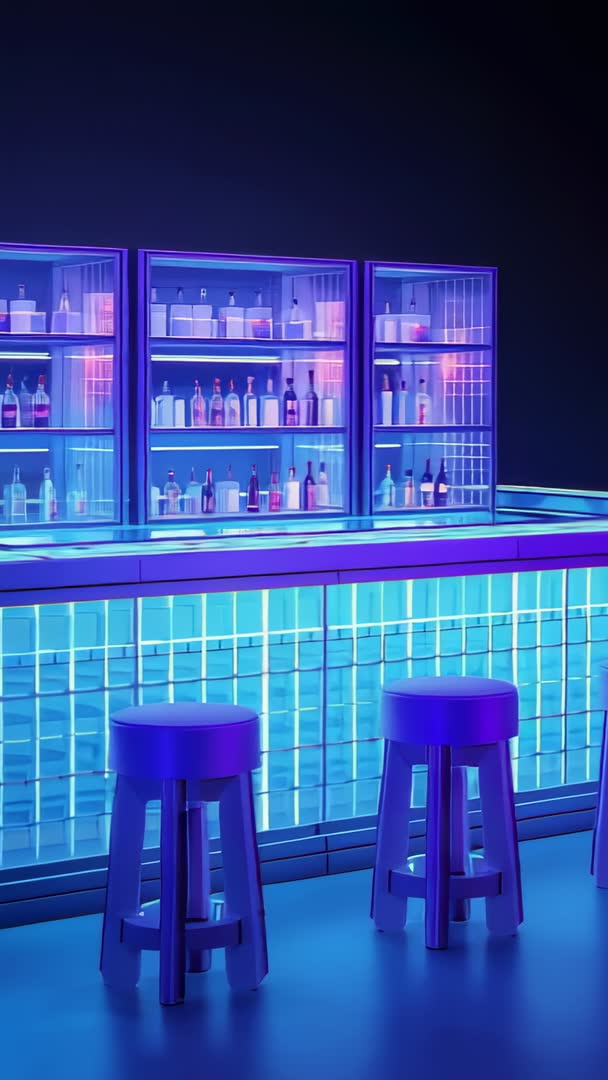 AI Generated Video. Showing slow right pan across neon-lit bar with three stools and LED backlit shelves. Using rich purple and blue lighting to create glossy reflective surfaces and moody nightlife atmosphere. Featuring backlit bottles and glassware adding depth and color contrast. Working well for social media stories, nightlife promotions, club event teasers, music video backgrounds, hospitality marketing, and product ads. Fitting mobile-first vertical formats for TikTok, Instagram Stories, Snapchat, and vertical video ads. Leaving negative space at top and left for logo and text overlay. Providing loopable clip option for seamless backgrounds and in-store digital signage. Suggesting color grade adjustments: boosting cyan and magenta highlights, increasing contrast for dramatic look, softening shadows for detail retention.