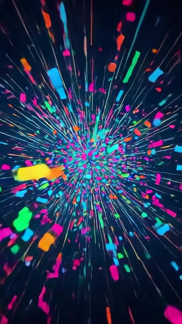 - Vertical neon confetti burst expanding outward in dark void, vibrant abstract motion loop