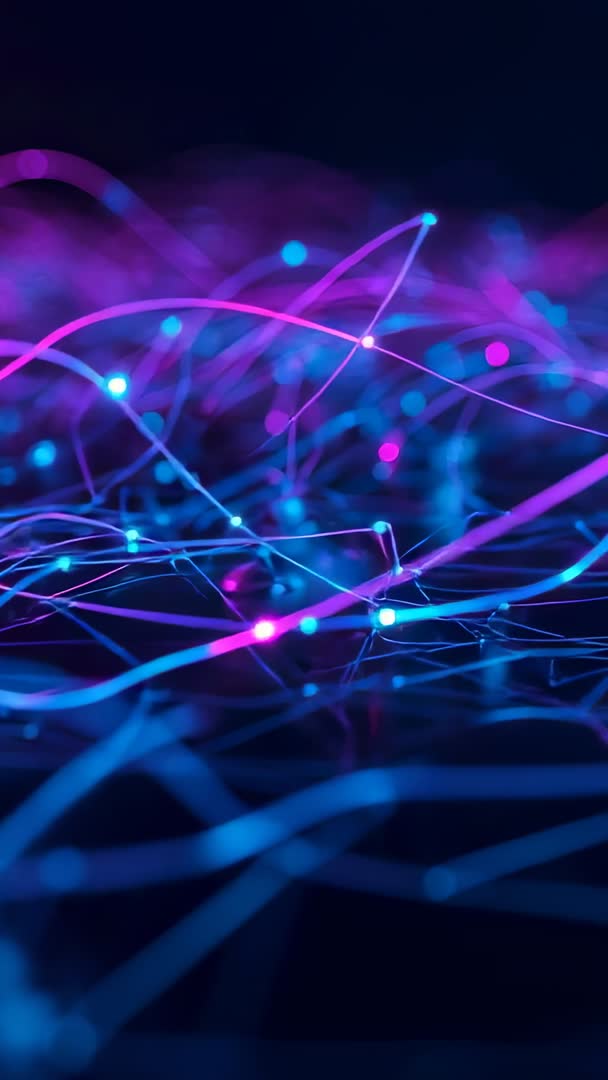 AI Generated Image. Vertical loop showcasing neon cyan and magenta filaments rippling across pulsing mesh nodes. Motion featuring shallow depth of field, glowing dots traveling along thin strands and soft bokeh highlights. Useful for tech presentations, app intros, UI backgrounds, social media vertical ads, live event visuals and music video backdrops. Working well for themes like data flow, neural networks, connectivity, cyber security and futuristic design. Easily loopable for continuous playback. Delivering high-energy abstract motion for promotional reels, website hero sections, digital signage and broadcast graphics.