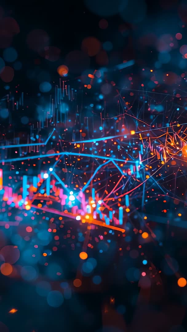 AI Generated Image. Abstract vertical video showing neon network pulsing across dark space, revealing candlestick charts, trend lines, and glowing nodes amid floating bokeh and particle sparks. Cinematic camera shift creating depth and motion while highlighting data flow and market activity. High-contrast neon palette blending blue and orange for futuristic tech mood. Ideal for use in fintech and trading intros, mobile app backgrounds, social media stories, pitch decks, broadcast graphics, and motion design templates. Editing-friendly composition allowing overlaying of logos, titles, and data labels while maintaining readable chart elements.