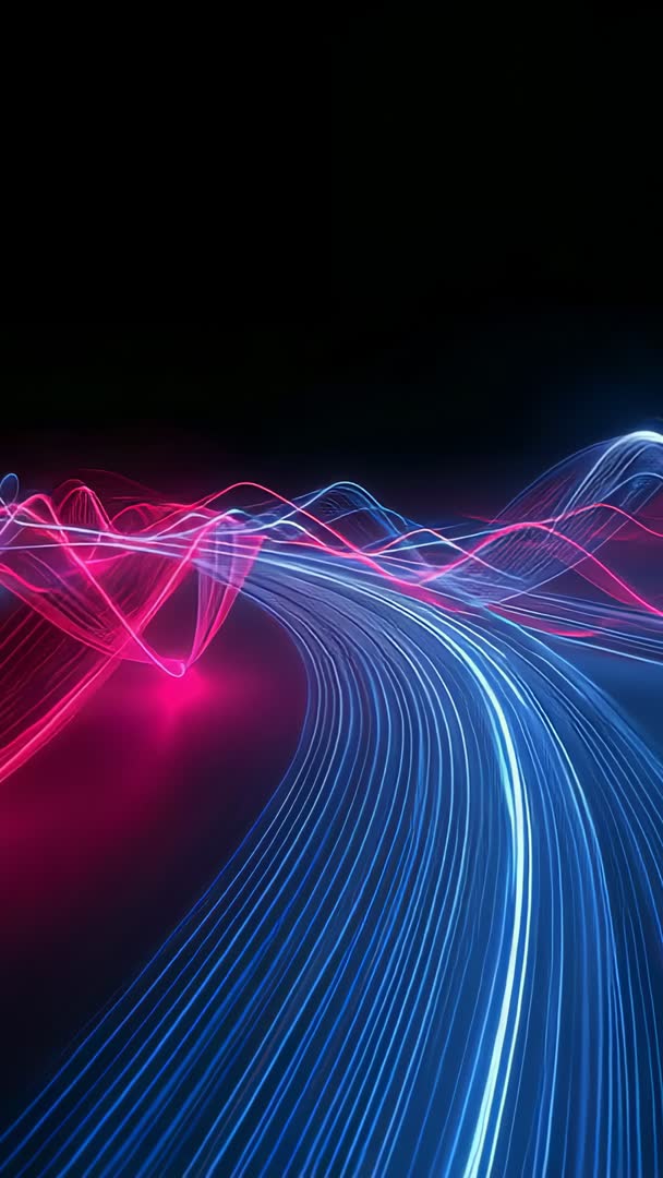 AI Generated Image. Vertical video showing neon light stream curving toward distant horizon over black void. Blue lines forming ribbon-like trails while pink and cyan waves crossing above, creating layered waveform and glowing node highlights. Camera movement suggesting forward motion and high velocity, producing sense of corridor or data tunnel. Composition providing large upper black area for headline or branding and strong lower motion lines for logo reveal. Ideal for tech product promos, mobile app intros, social media stories, event visuals, music visualizers, website hero banners, and broadcast title sequences. Video working well as loopable background for presentations, motion graphics overlays, or smartphone lock screen animations.